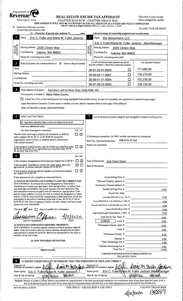 | 1 | 03/18/2020 | QCD | QUIT CLAIM DEED | FULLER ERIC C & DIANE M FULLER JACKSON | DIE WEIZENFARM LLC | | | $0.00 | 138889 | 2020-02926 |
