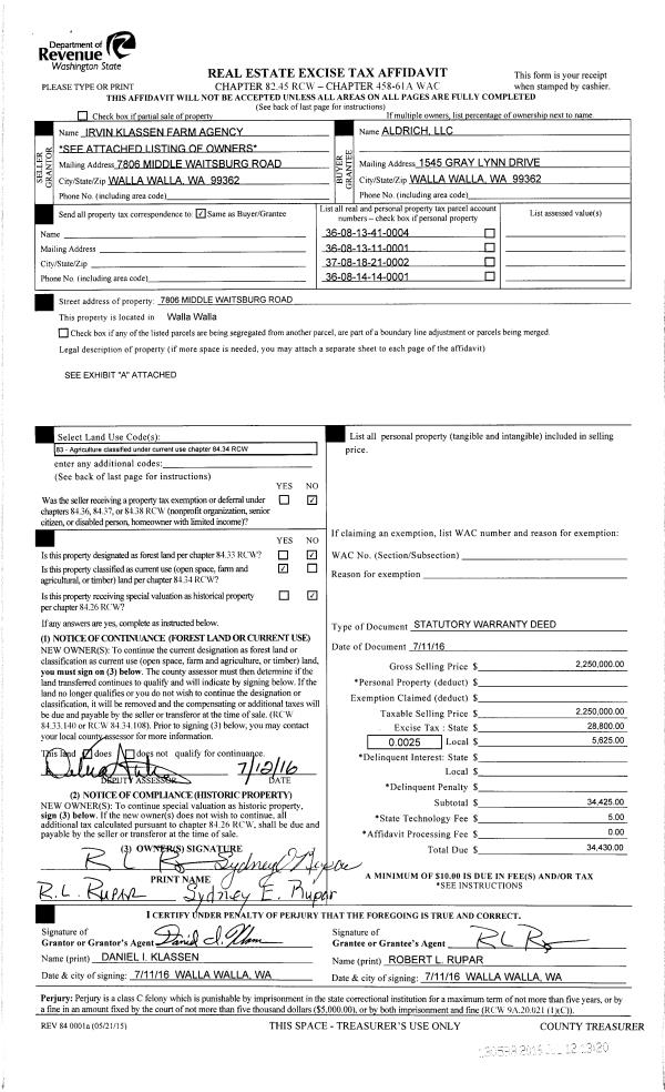 | 1 | 07/11/2016 | SWD | STATUTORY WARRANTY DEED | KLASSEN RONALD W | ALDRICH LLC | | 4-PARCELS | $2,250,000.00 | 130598 | 2016-05384 |