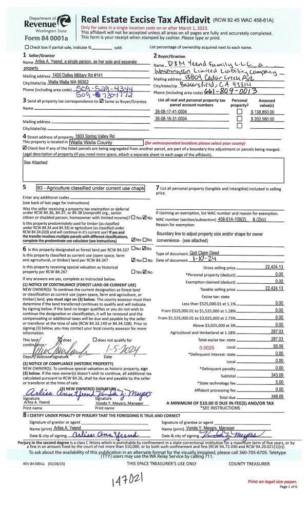| 1 | 01/16/2024 | QCD | QUIT CLAIM DEED | YEEND ARLISS ANN | D & M YEEND FAMILY LLC | | | $22,424.00 | 147021 | 2024-00212 |