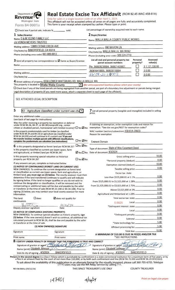 | 1 | 02/14/2025 | EASE | EASEMENT | D & M YEEND FAMILY LLC | WALLA WALLA COUNTY | | | | 147401 | 2024-01893 |