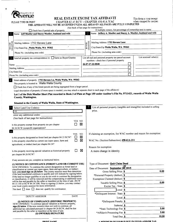 | 1 | 09/18/2015 | QCD | QUIT CLAIM DEED | MOELLER JEFF A & STACY A | MOELLER JEFFERY A & STACEY A | | | $0.00 | 128869 | 2015-08345 |