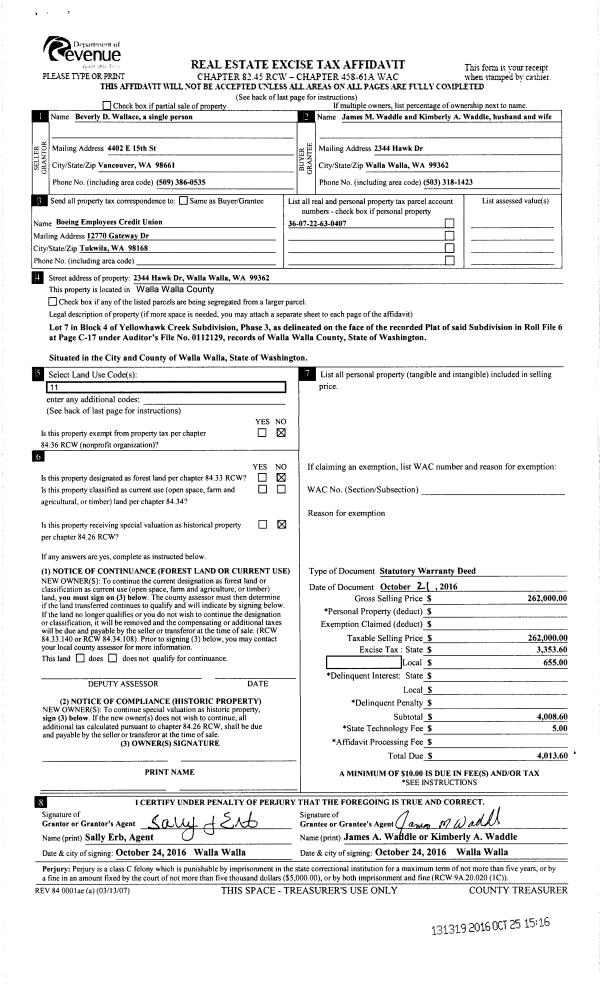 | 1 | 10/25/2016 | SWD | STATUTORY WARRANTY DEED | WALLACE BEVERLY D | WADDLE JAMES M & KIMBERLY A | | | $262,000.00 | 131319 | 2016-08857 |
