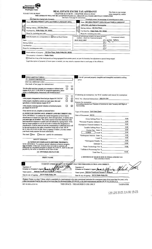 | 1 | 06/04/2015 | QCD | QUIT CLAIM DEED | PREWITT MELINDA | PREWITT MELINDA | | | $0.00 | 128128 | 2015-04827 |