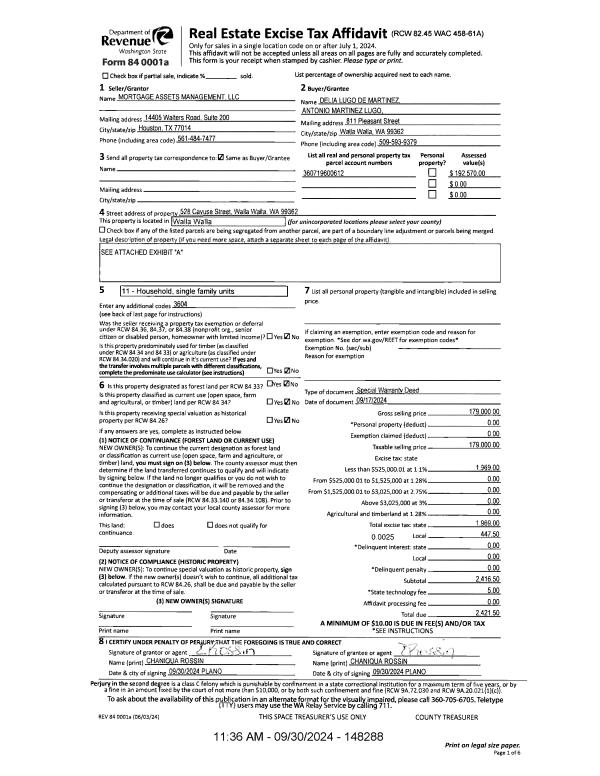 | 1 | 09/30/2024 | SWP | Special Warranty Deed | MORTGAGE ASSETS MANAGEMENT LLC | LUGO DE MARTINEZ DELIA | | | $179,000.00 | 148288 | 2024-05631 |