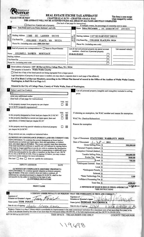 | 5 | 02/04/2011 | WARRANTY D | WARRANTY DEED | FOUST, TOM & LYNN | MC CORMICK, DEBRA | | | $300,000.00 | 119698 | 2011-01139 |