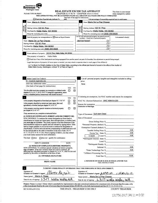 | 1 | 01/03/2017 | QCD | QUIT CLAIM DEED | ROJAS MARCO A | CHAVEZ MARIA DE LA PAZ | | | $0.00 | 131756 | 2017-00286 |