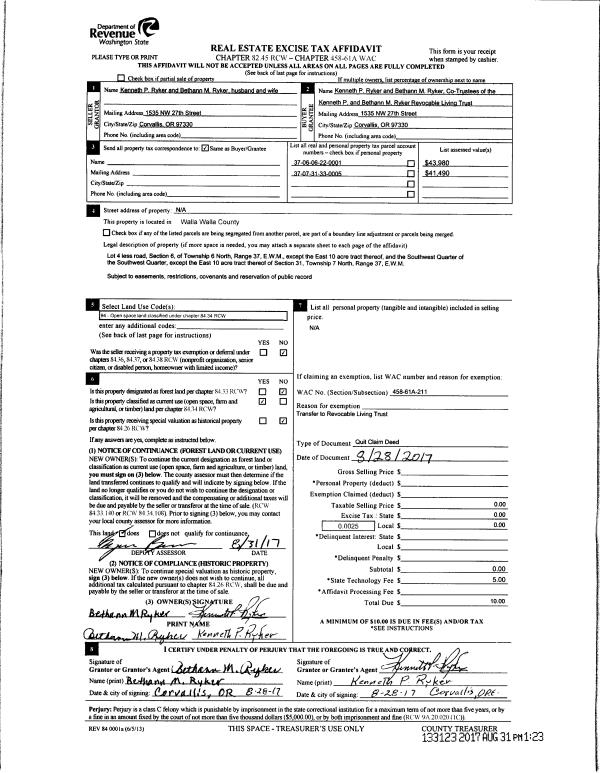 | 1 | 08/28/2017 | QCD | QUIT CLAIM DEED | RYKER KENNETH & BETHANN | RYKER KENNETH P & BETHANN M REVOCABLE LIVING TRUST | | | $0.00 | 133123 | 2017-06845 |