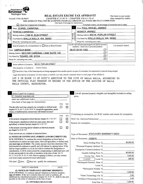 | 1 | 10/29/2015 | SWD | STATUTORY WARRANTY DEED | CARMONA EURIEL & TERESA | JIMENEZ PAUL & MONICA | | | $80,000.00 | 129098 | 2015-09478 |