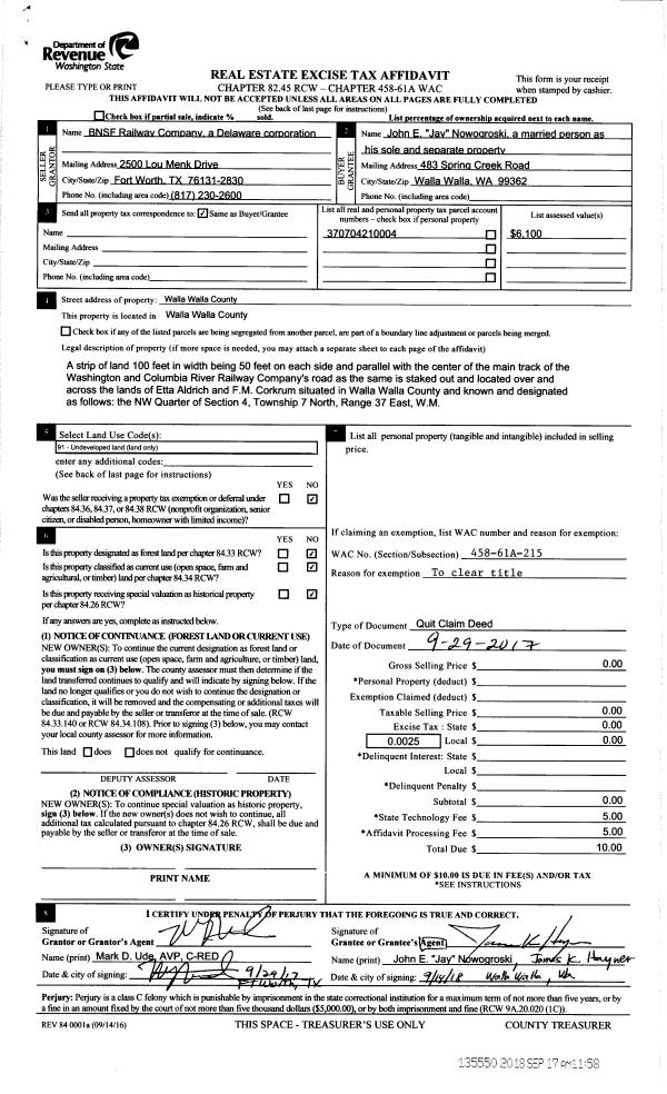 | 1 | 09/14/2018 | QCD | QUIT CLAIM DEED | BNSF RAILWAY COMPANY | NOWOGROSKI JOHN E | | | $0.00 | 135550 | 2018-07711 |