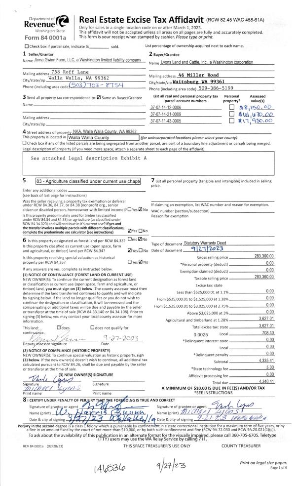 | 1 | 09/27/2023 | SWD | STATUTORY WARRANTY DEED | ANNE GWINN FARM LLC | LYONS LAND AND CATTLE INC | | 3-PARCELS | $283,360.00 | 146536 | 2023-05658 |