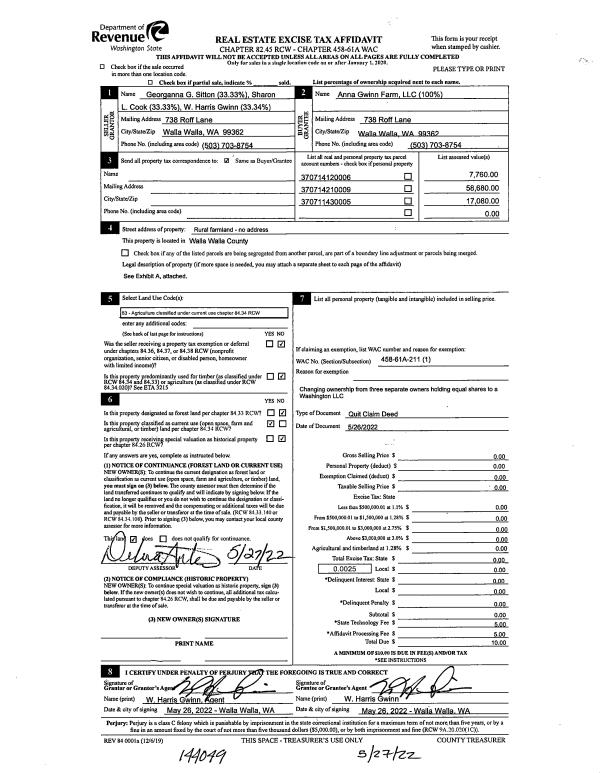 | 2 | 05/26/2022 | QCD | QUIT CLAIM DEED | SITTON GEORGANNA G ET AL | ANNE GWINN FARM LLC | | 3-PARCELS | $0.00 | 144049 | 2022-04631 |