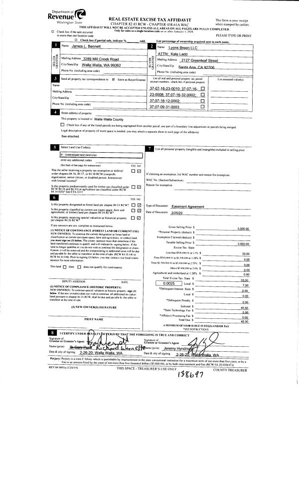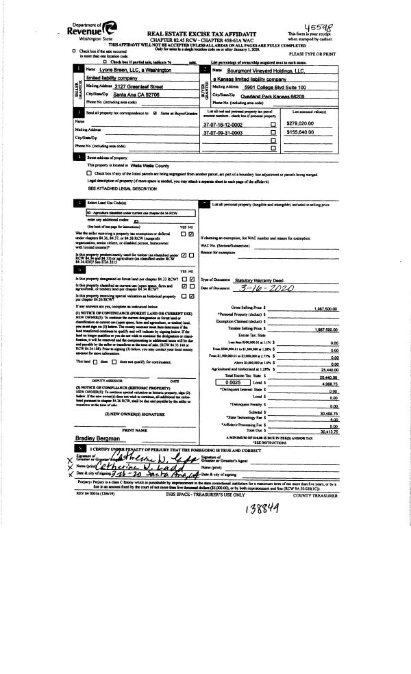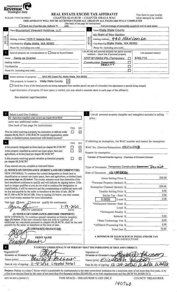 | 2 | 01/19/2021 | EASE | EASEMENT | BOURGMONT VINEYARD HOLDINGS LLC | WALLA WALLA COUNTY | | | $935.00 | 140759 | 2021-00698 |
