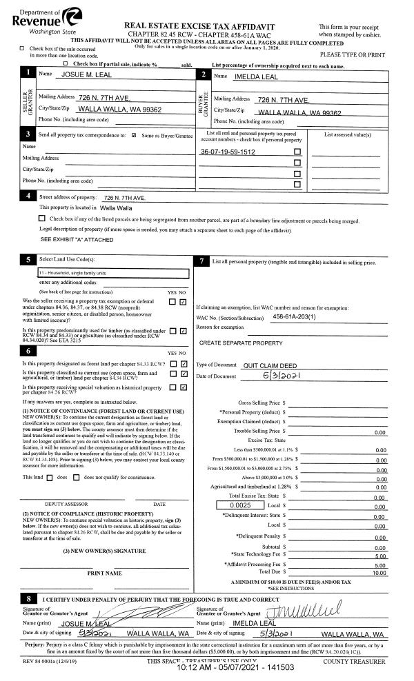 | 1 | 05/03/2021 | QCD | QUIT CLAIM DEED | LEAL JOSUE M | LEAL IMELDA | | | $0.00 | 141503 | 2021-05440 |