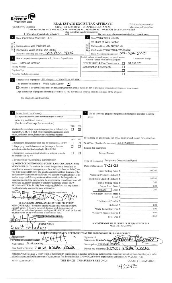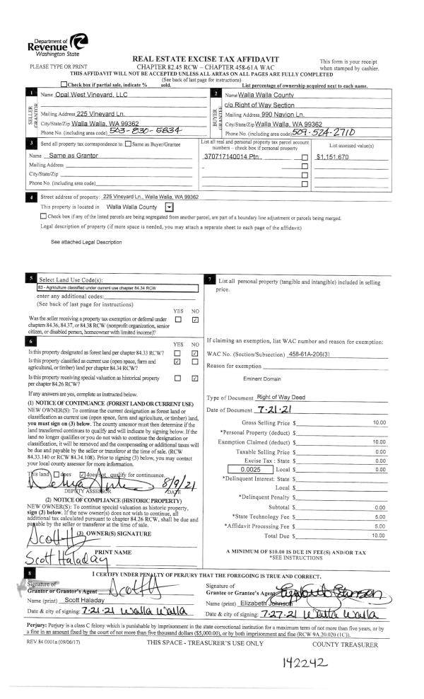 | 1 | 08/09/2021 | EASE | EASEMENT | OPAL WEST VINEYARD LLC | WALLA WALLA COUNTY OF | | | | 142242 | 2021-09669 |
