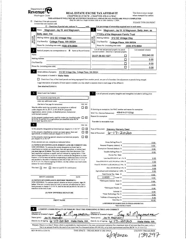 | 1 | 06/17/2020 | SWD | STATUTORY WARRANTY DEED | MAGNUSON JAY W & BETTY JEAN | MAGNUSON FAMILY TRUST | | | $0.00 | 139297 | 2020-05531 |