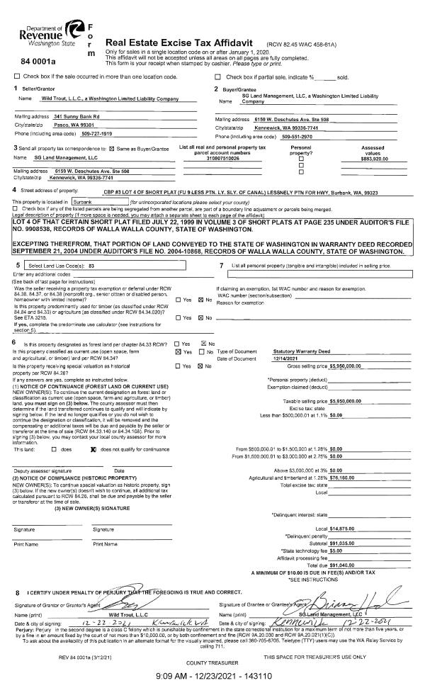 | 1 | 12/23/2021 | SWD | STATUTORY WARRANTY DEED | WILD TROUT LLC | SG LAND MANAGEMENT LLC | | | $5,950,000.00 | 143110 | 2021-14988 |
