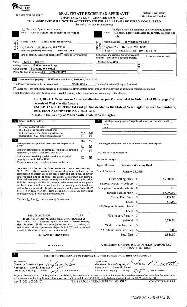 | 2 | 01/29/2018 | SWD | STATUTORY WARRANTY DEED | SIMONTON AMY E | BARRETT GLENN R & ALICE R | | | $166,000.00 | 134059 | 2018-00794 |