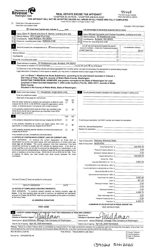 | 1 | 05/04/2020 | SWD | STATUTORY WARRANTY DEED | BARRETT GLENN R & ALICE R | HUNSAKER MICHAEL & CHELSIE | | | $332,500.00 | 139026 | 2020-03834 |