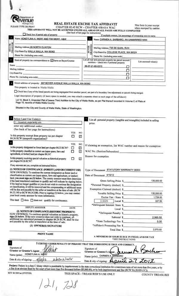 | 4 | 04/27/2012 | WARRANTY D | WARRANTY DEED | WERT, HONEYLINA A | BARBARO, CARMEN A | | | $135,000.00 | 121728 | 2012-03373 |