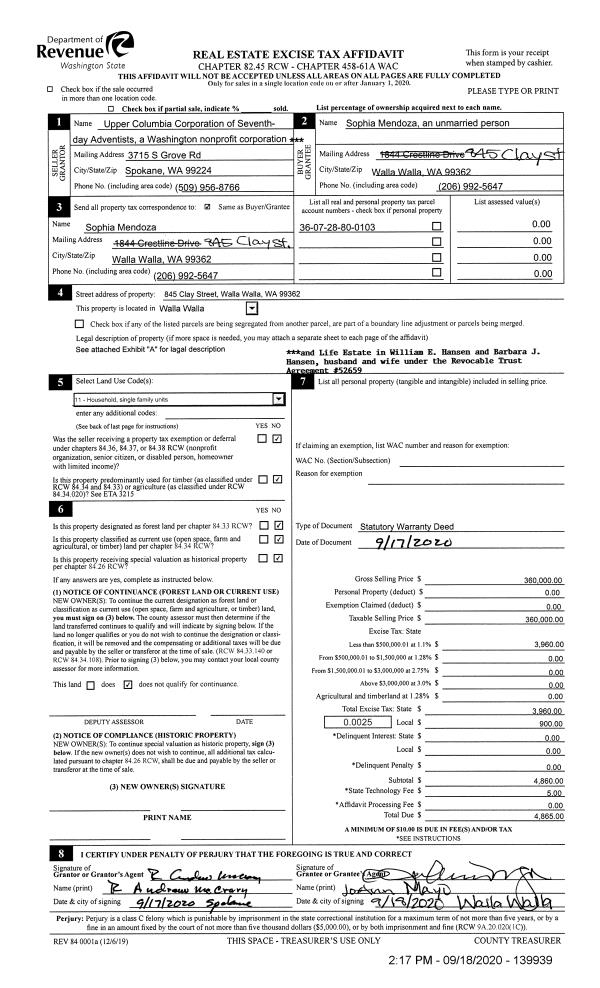 | 1 | 09/18/2020 | SWD | STATUTORY WARRANTY DEED | HANSEN WM & BARBARA LIFE EST | MENDOZA SOPHIA | | | $360,000.00 | 139939 | 2020-09586 |