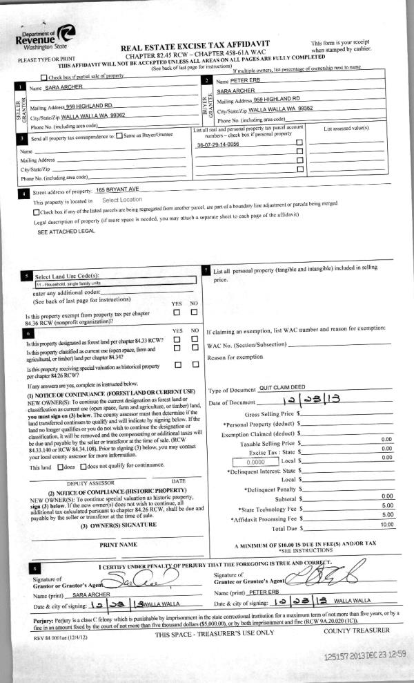 | 1 | 12/23/2013 | QCD | QUIT CLAIM DEED | ARCHER SARA | ERB PETER | | | | 125157 | 2013-12205 |