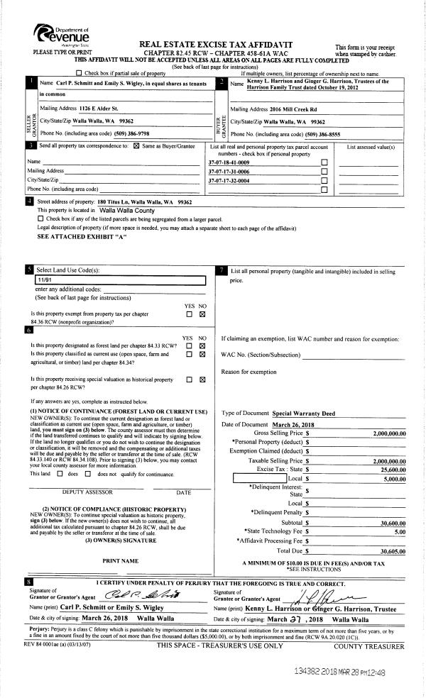 | 1 | 03/28/2018 | SWD | STATUTORY WARRANTY DEED | SCHMITT CARL P | HARRISON FAMILY TRUST | | 3-PARCELS | $2,000,000.00 | 134382 | 2018-02392 |