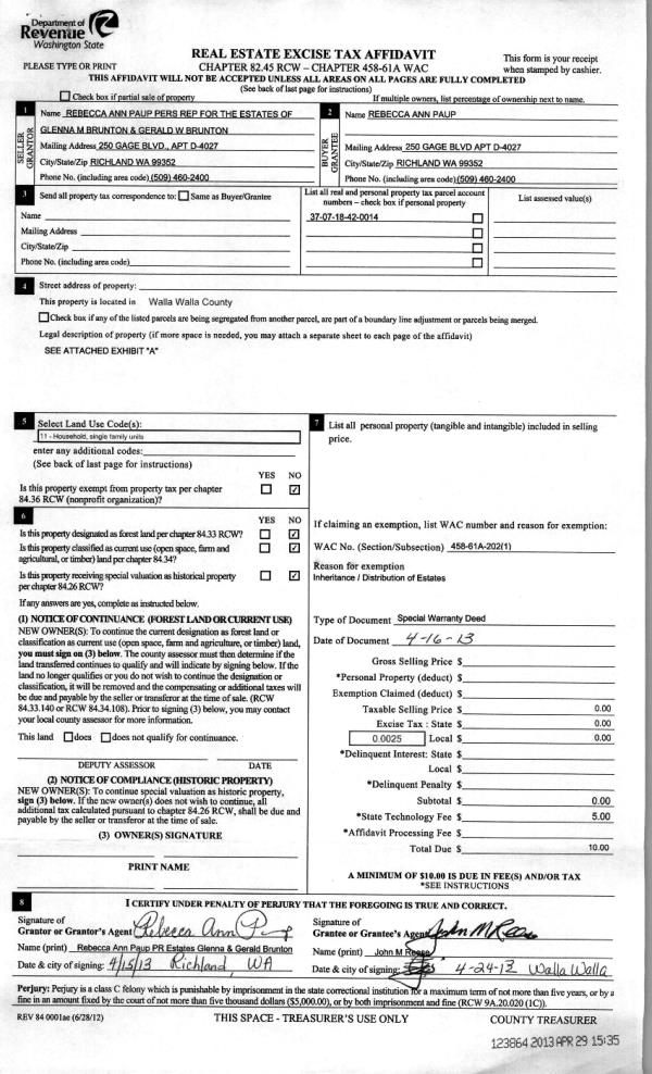 | 2 | 04/29/2013 | WARRANTY D | WARRANTY DEED | BRUNTON, GERALD W ESTATE OF | PAUP, REBECCA ANN | | | $0.00 | 123864 | 2013-04194 |