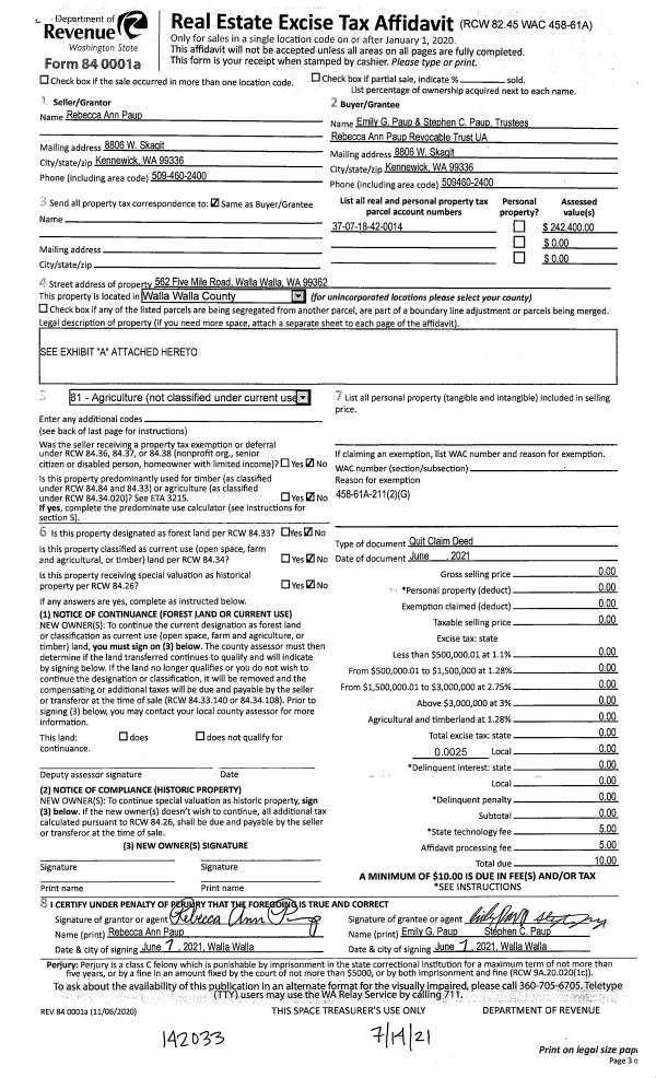 | 1 | 07/07/2021 | QCD | QUIT CLAIM DEED | PAUP REBECCA ANN | PAUP REBECCA ANN REVOCABLE TRUST | | | $0.00 | 142033 | 2021-08562 |