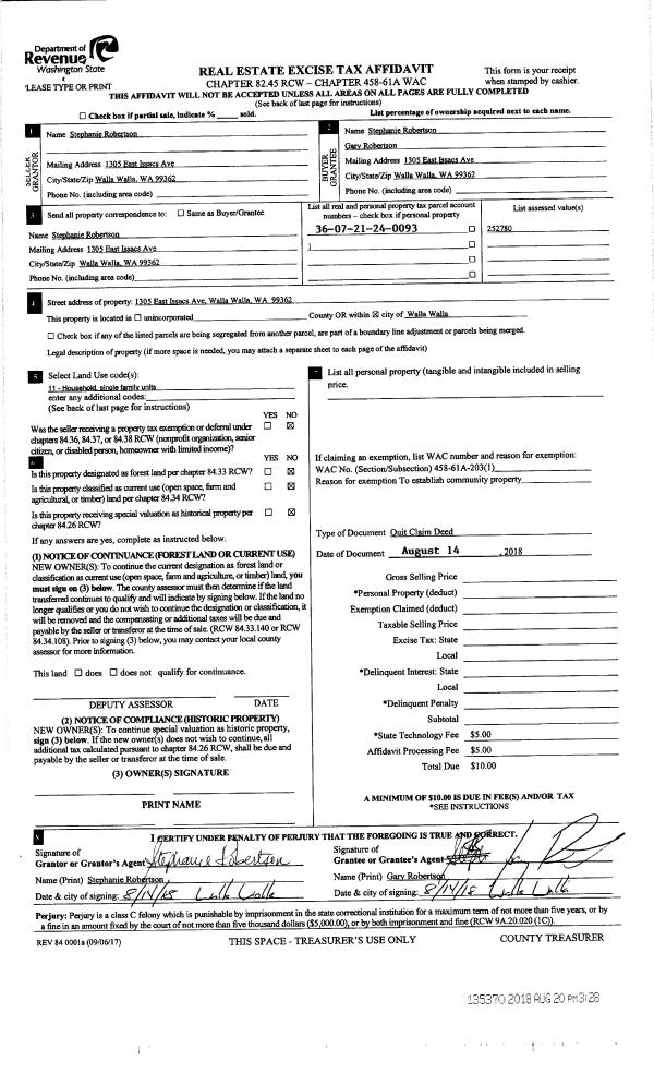 | 2 | 08/14/2018 | QCD | QUIT CLAIM DEED | LINKLATER STEPHANIE A | ROBERTSON GARY & STEPHANIE | | | $0.00 | 135370 | 2018-06858 |