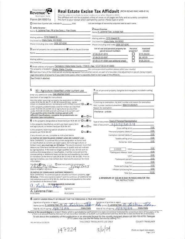| 1 | 03/06/2024 | DPR | DEED OF PERSONAL REPRESENTATIVE | FILAN DORIS L | FILAN A LAVERNE | | | | 147224 | 2024-01108 |