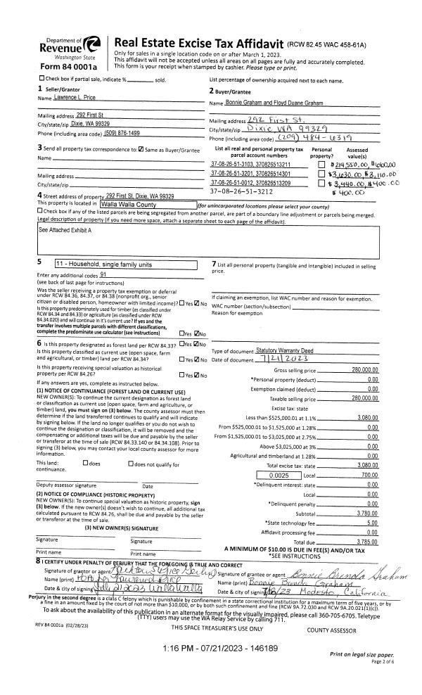 | 1 | 07/21/2023 | SWD | STATUTORY WARRANTY DEED | PRICE LAWRENCE L | GRAHAM BONNIE BRENDA & FLOYD DUANE | | 7-PARCELS | $280,000.00 | 146189 | 2023-04143 |