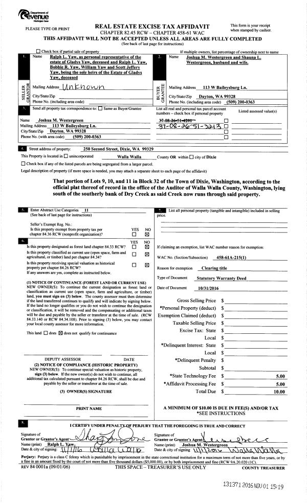 | 2 | 10/31/2016 | SWD | STATUTORY WARRANTY DEED | YAW GLADYS ESTATE OF | WESTERGREEN JOSHUA M & SHAUNA L | | | | 131371 | 2016-09090 |