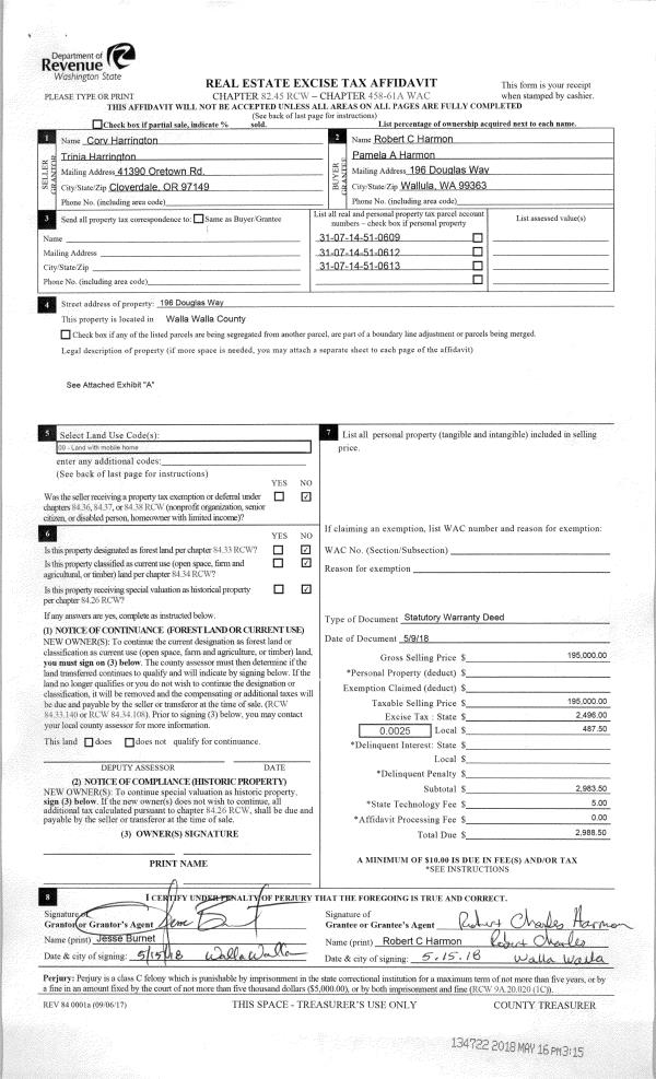 | 1 | 05/16/2018 | SWD | STATUTORY WARRANTY DEED | HARRINGTON CORY & TRINIA | HARMON ROBERT CHARLES & PAMELA ANN | | 3-PARCELS | $195,000.00 | 134722 | 2018-03873 |
