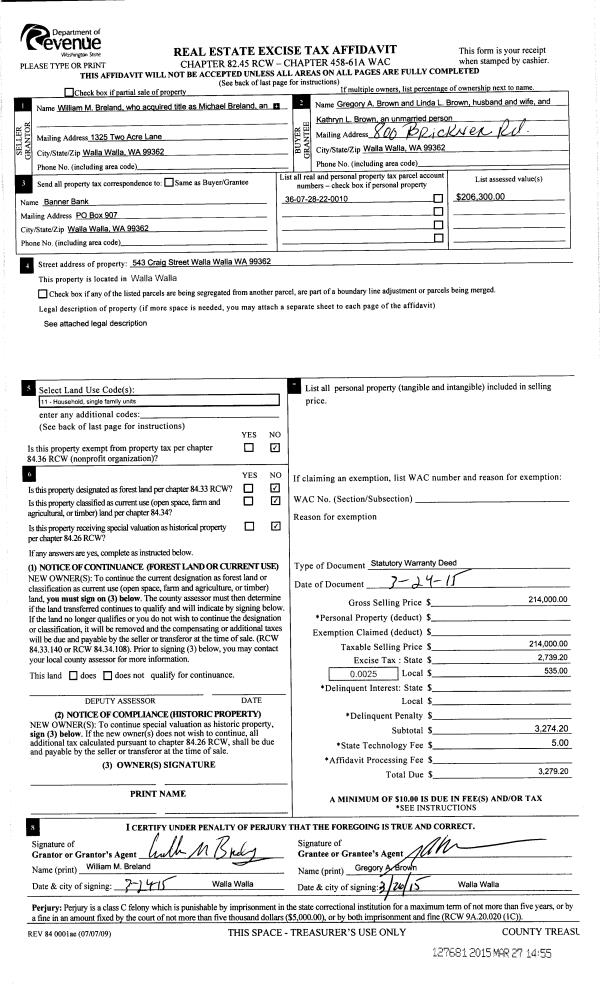 | 3 | 03/27/2015 | SWD | STATUTORY WARRANTY DEED | BRELAND MICHAEL | BROWN GREGORY A & LINDA L | | | $214,000.00 | 127681 | 2015-02539 |