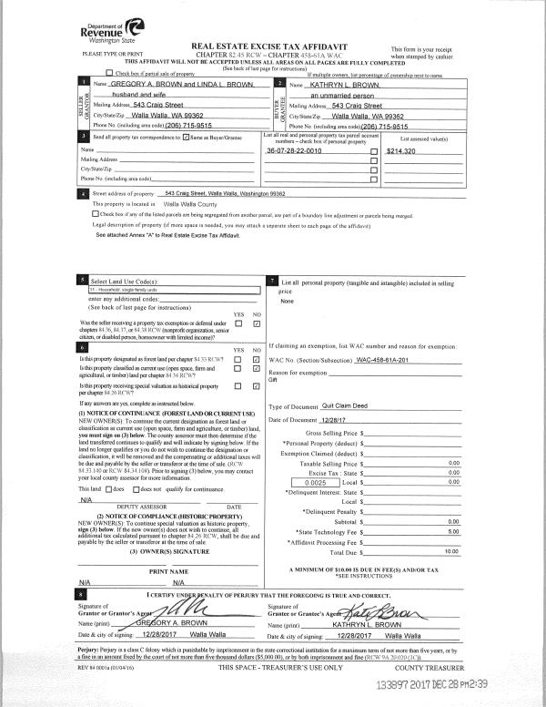 | 2 | 12/28/2017 | QCD | QUIT CLAIM DEED | BROWN GREGORY A & LINDA L | BROWN KATHRYN L | | | $0.00 | 133897 | 2017-10467 |