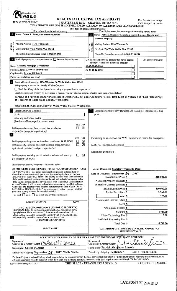 | 4 | 09/29/2017 | SWD | STATUTORY WARRANTY DEED | JONES COLEEN | LINCOLN PATRICK ALEXANDER | | 2-PARCELS | $310,000.00 | 133318 | 2017-07729 |