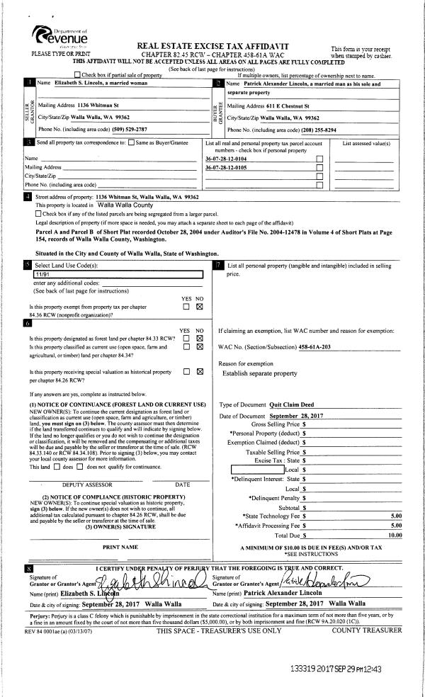 | 3 | 09/28/2017 | QCD | QUIT CLAIM DEED | LINCOLN ELIZABETH S | LINCOLN PATRICK ALEXANDER | | 2-PARCELS | | 133319 | 2017-07730 |