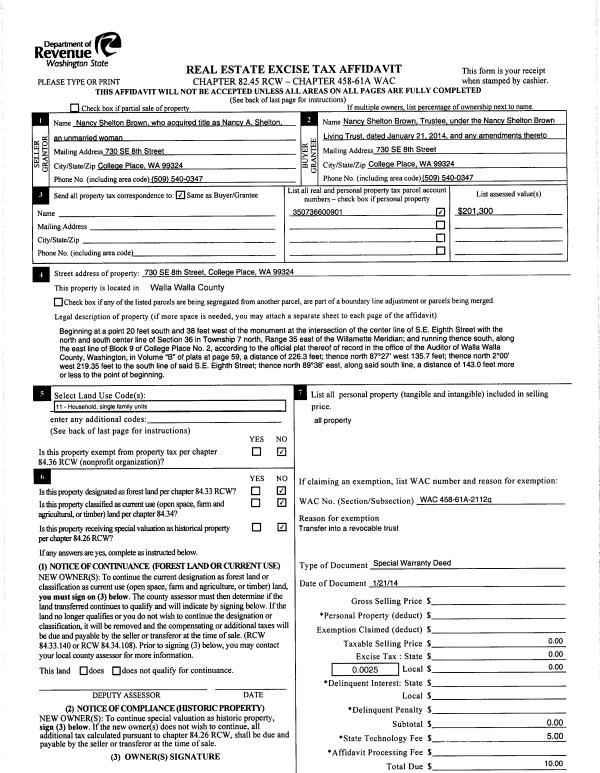 | 2 | 04/29/2014 | WARRANTY D | WARRANTY DEED | SHELTON NANCY A | THE NANCY SHELTON BROWN LIVING TRUST | | | $0.00 | 125686 | 2014-02868 |