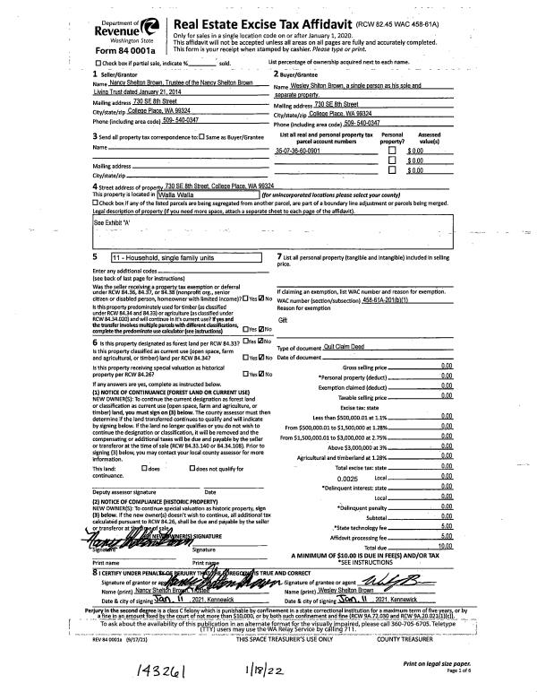 | 1 | 01/11/2022 | QCD | QUIT CLAIM DEED | THE NANCY SHELTON BROWN LIVING TRUST | BROWN WESLEY SHELTON | | | $0.00 | 143261 | 2022-00570 |