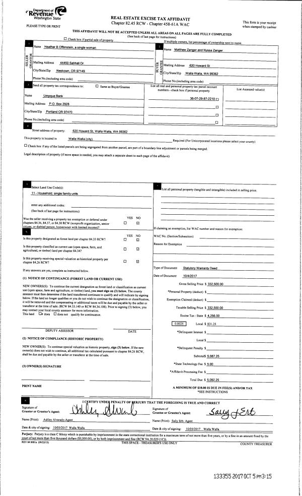 | 3 | 10/05/2017 | SWD | STATUTORY WARRANTY DEED | OFFENSTEIN HEATHER B | ZANGER MATTHEW & NYSSA | | | $332,500.00 | 133355 | 2017-07925 |
