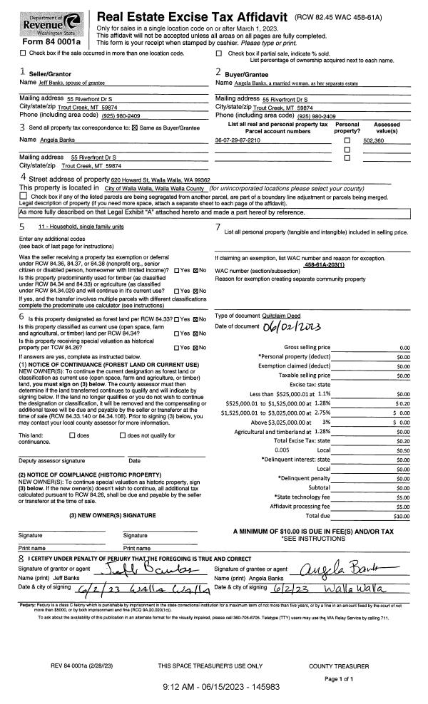 | 1 | 06/15/2023 | QCD | QUIT CLAIM DEED | BANKS JEFF | BANKS ANGELA | | | | 145983 | 2023-03287 |