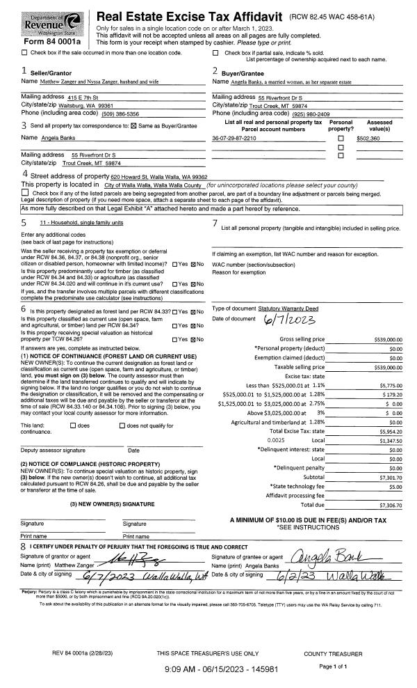 | 2 | 06/15/2023 | SWD | STATUTORY WARRANTY DEED | ZANGER MATTHEW & NYSSA | BANKS ANGELA | | | $539,000.00 | 145981 | 2023-03286 |