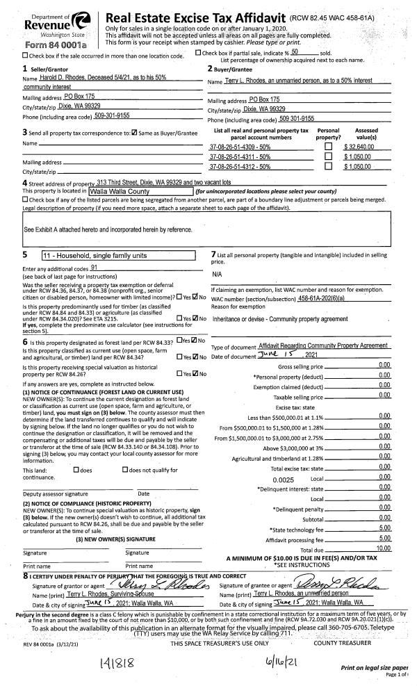 | 1 | 06/15/2021 | AFFIDAVIT | AFFIDAVIT | RHODES HAROLD D & TERRY L | RHODES TERRY L | | 3 PARCELS | $0.00 | 141818 | 2021-07343 |