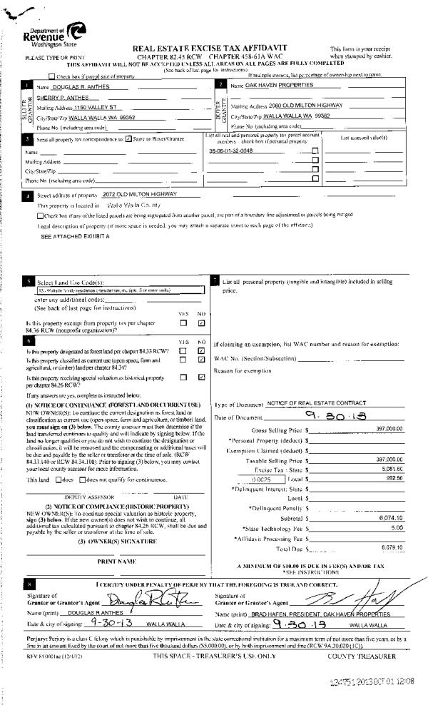 | 1 | 10/01/2013 | WARRANTY D | WARRANTY DEED | ANTHES, DOUGLAS R & SHERRY P | OAK HAVEN PROPERTIES INC | | | $397,000.00 | 124751 | 2013-09964 |