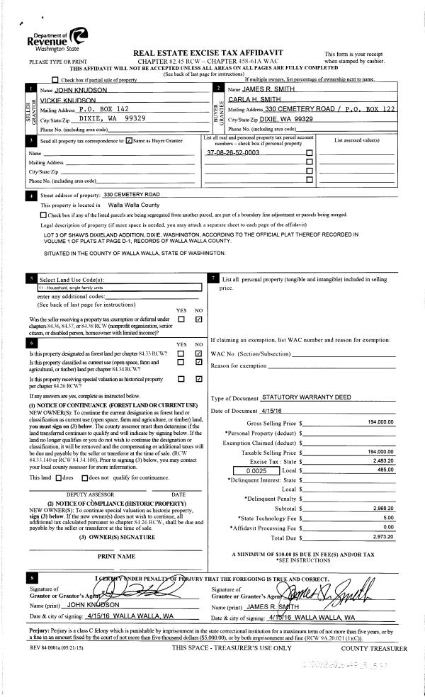 | 2 | 04/15/2016 | SWD | STATUTORY WARRANTY DEED | KNUDSON JOHN & VICKIE | SMITH JAMES R & CARLA H | | | $194,000.00 | 130032 | 2016-02777 |