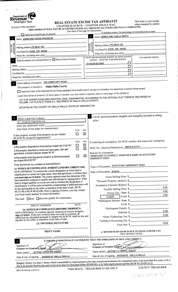 | 1 | 04/15/2016 | WARRANTY D | WARRANTY DEED | KNUDSON JOHN & VICKIE | SMITH JAMES R & CARLA R | | | | 130124 | 2016-03193 |