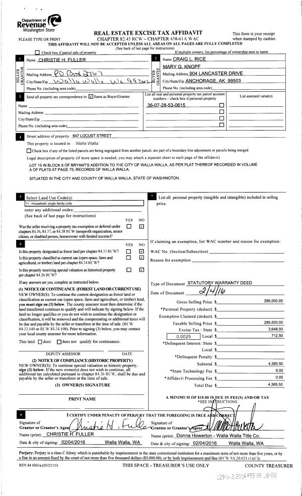 | 1 | 02/08/2016 | SWD | STATUTORY WARRANTY DEED | FULLER CHRISTIE H | RICE CRAIG L | | | $285,000.00 | 129642 | 201600961 |