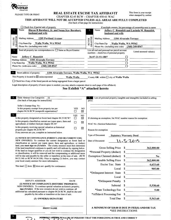 | 3 | 11/10/2015 | SWD | STATUTORY WARRANTY DEED | BARNHART BLAYNE JR & SUSAN KAY | ROSENFELT JEFFERY C & LUCINDA M | | | $362,000.00 | 129174 | 2015-09818 |