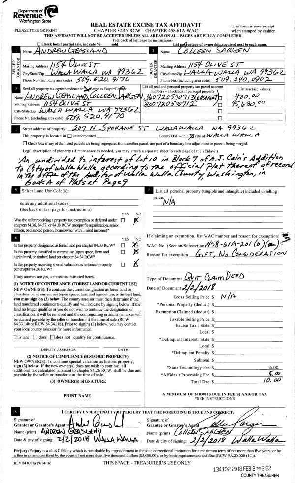 | 2 | 02/02/2018 | QCD | QUIT CLAIM DEED | GEASLAND ANDREW | GEASLAND ANDREW | | | $0.00 | 134102 | 2018-00965 |