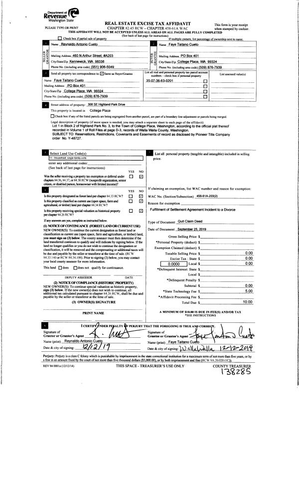 | 1 | 12/12/2019 | QCD | QUIT CLAIM DEED | CUETO REYNALDO A & FAYE T | CUETO FAYE TAITANO | | | $0.00 | 138285 | 2019-10544 |